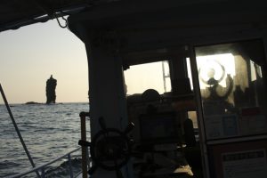 ローソク島は高さ20メートルの細長い島で、昼間は隠岐諸島の海に浮かぶ小島のひとつ。